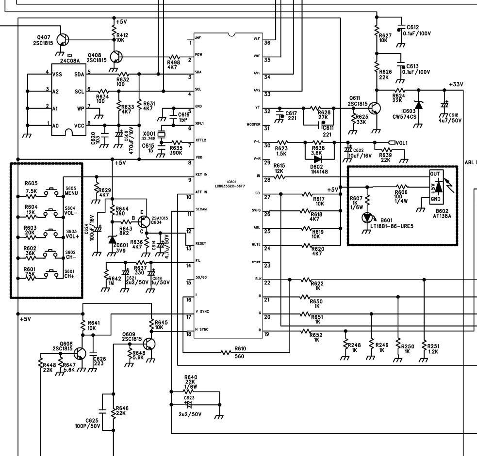 6 и 7 пин генератор-кварц Х001 22,764 мгц, C615, R635. Обычно напряжение на этих ногах 1,5-2,5 вольта.