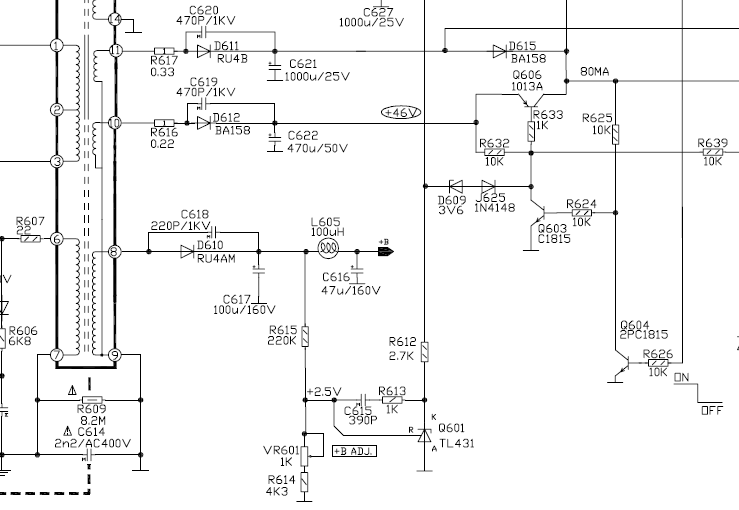 После замены подозрительного транзистора Q605 лампа горит постоянно и напряжение на +В 107 стабильно и не гаснет без лампы нагрузки нак же 180в и до 40 падает +В с лампой стабильно 107в