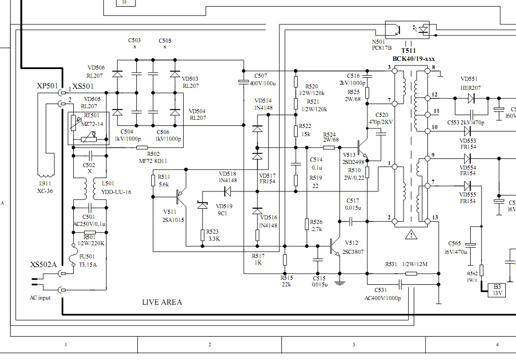 Шасси 2168S-3A: LC863532C, AT24C04/08, LA76810/8A, блок питания автогенераторного типа, схему прилагаю. Телевизор пришел в ремонт после грозы. Заменил сгоревшие V553 2SC1815, оптопару N501 PC817B и V512 2SC3807. Но последний заменил не родным, а похожим по параметрам, причем пробовал разные. В результате БП запускается, но все выходные напряжения занижены почти вдвое. Выходные цепи не садят. Предполагаю, что причина именно в задающем транзисторе V512 2SC3807. Вопрос - чем его можно заменить ? BP.jpg