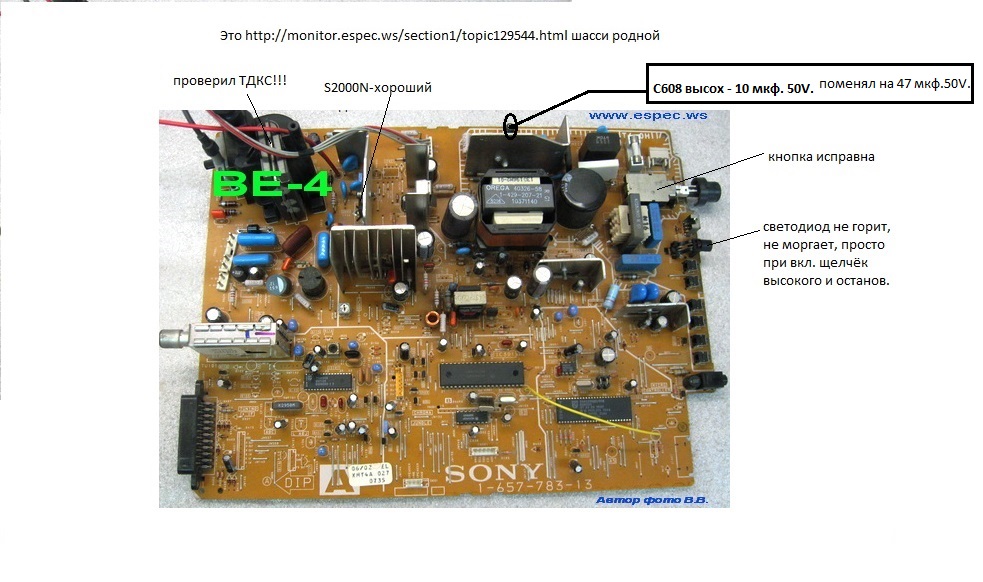 Проблема решилась заменой С608 10м*50v.\\\\\ Спасибо ребята, шасси то же, телек - KV-M2181KR, сборка ??? 1993 года, брал на ВДНХ. Всё решилось заменой С608