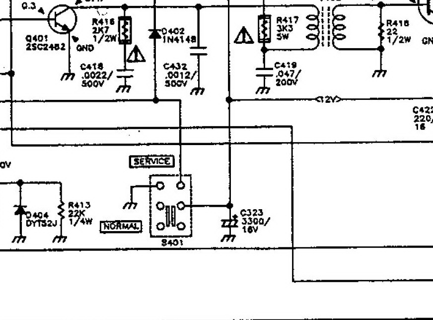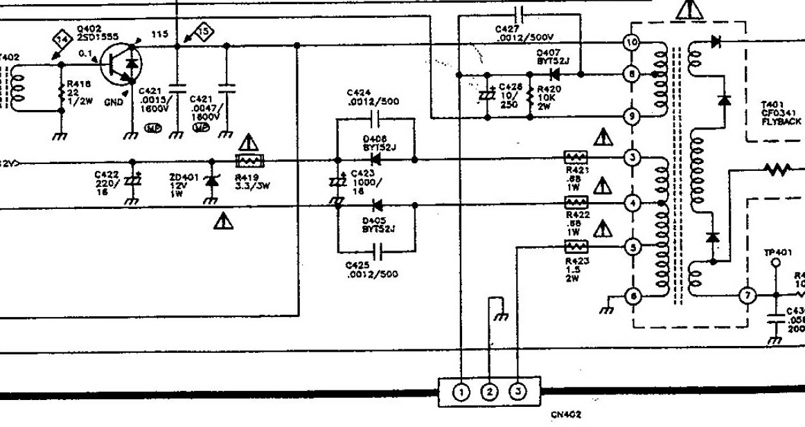 С блока питания напряжения сейчас согласно схеме. Что такое СР, если это строчная развертка, то на кадровую микросхему напряжения то же согласно схеме, но нет напряжения на D408, может в этом проблема.