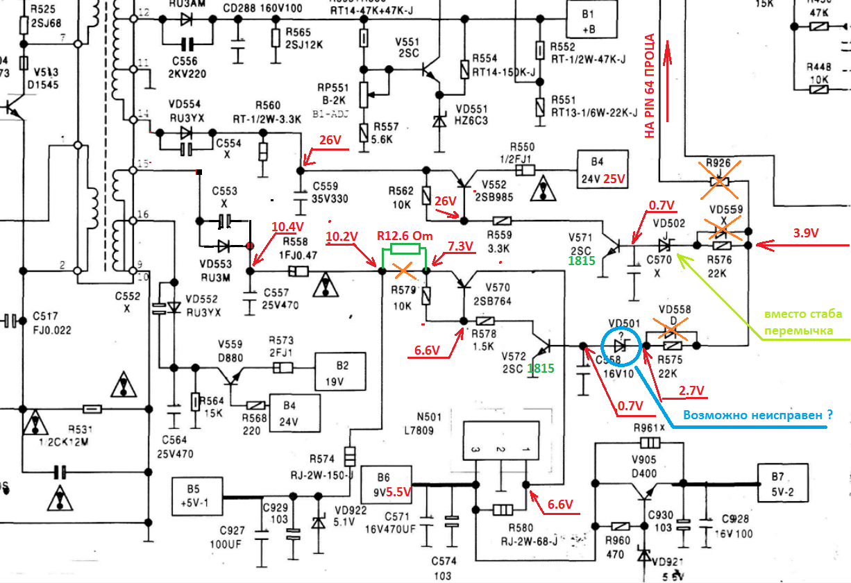 Возможно неисправен стабилитрон в цепи LM7809 (падение на нём 2v) завтра проверю. И ещё нашёл несостыковку в своих замерах, после R576 (22k) у меня намеряно 0.7v, хотя в в цепи на LM7809 после такого же резистора (22к) намеряно 2.7v. Возможно я зделал где то ошибку