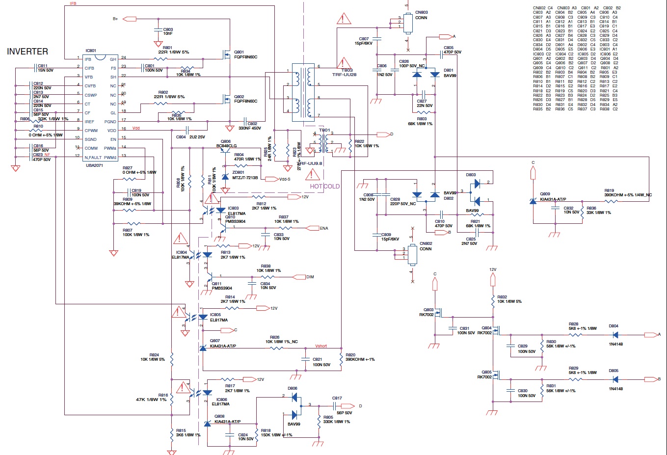 Проблема в инверторе собраном на UВА2071АТ в блоке питания. Подцветка включается когда ей "выгодно". Измерения невозможны т.к срабатывает защита при включении.