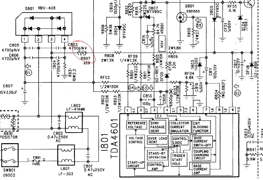 Стоит шасси СР-130 нет запуска БП. БП на TDA 4601, на 9 ноге микросхемы по схеме должно быть 11.5В, в моем случаи 0.5 В. Проверил резисторы R808, R809 рабочий, также в этой цепи стоит терморезистор R807 выпаял проверил показал 5.4 ком.