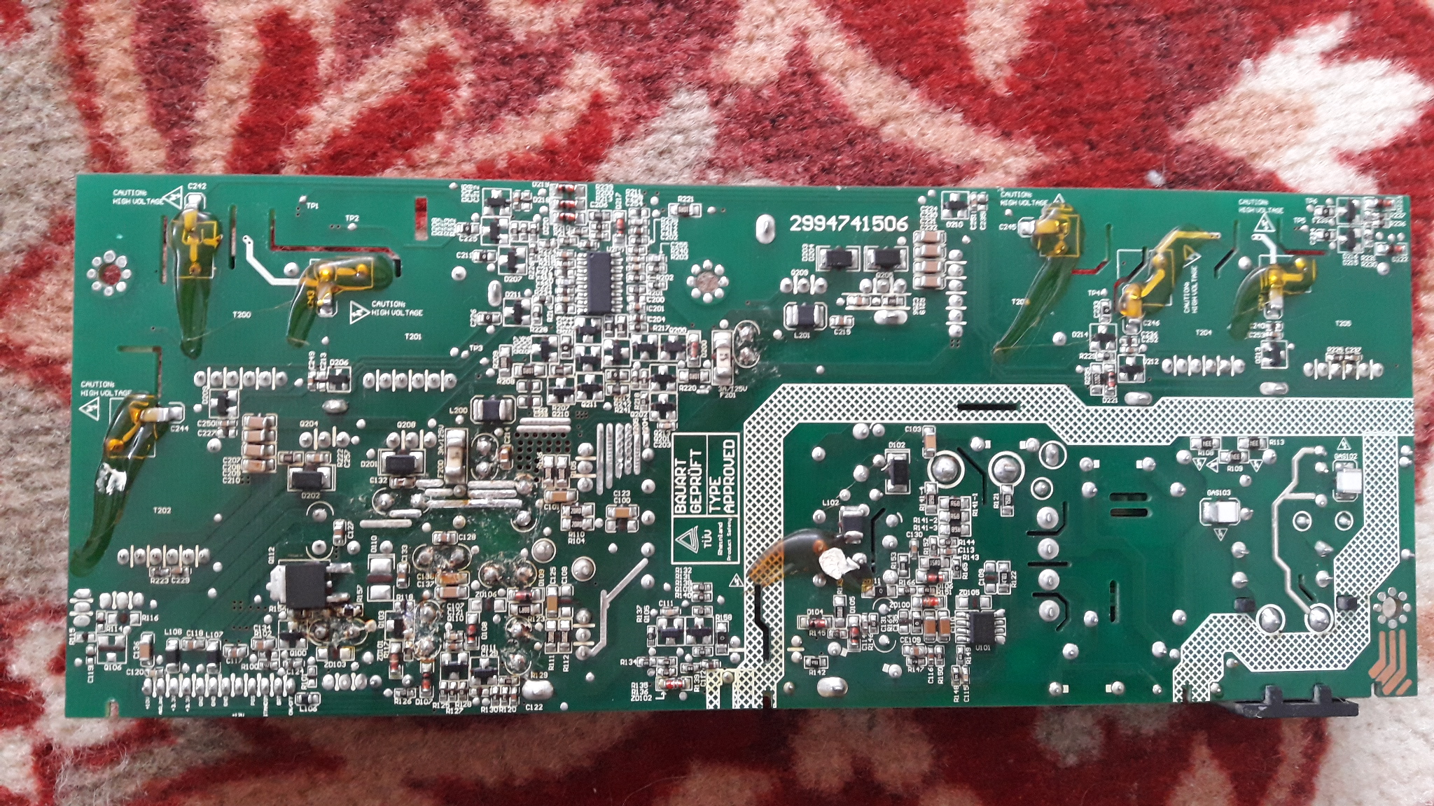 Телевизор перестал включаться после скачка напряжения во время грозы. Эксплуатируется уже давно, два раза реанимирован. В инверторе DAC-12M019 AOF (схему не нашел) и раньше вздувались электролиты, раз в три года примерно. При вскрытии очередной раз обнаружил три надутых электролита.
