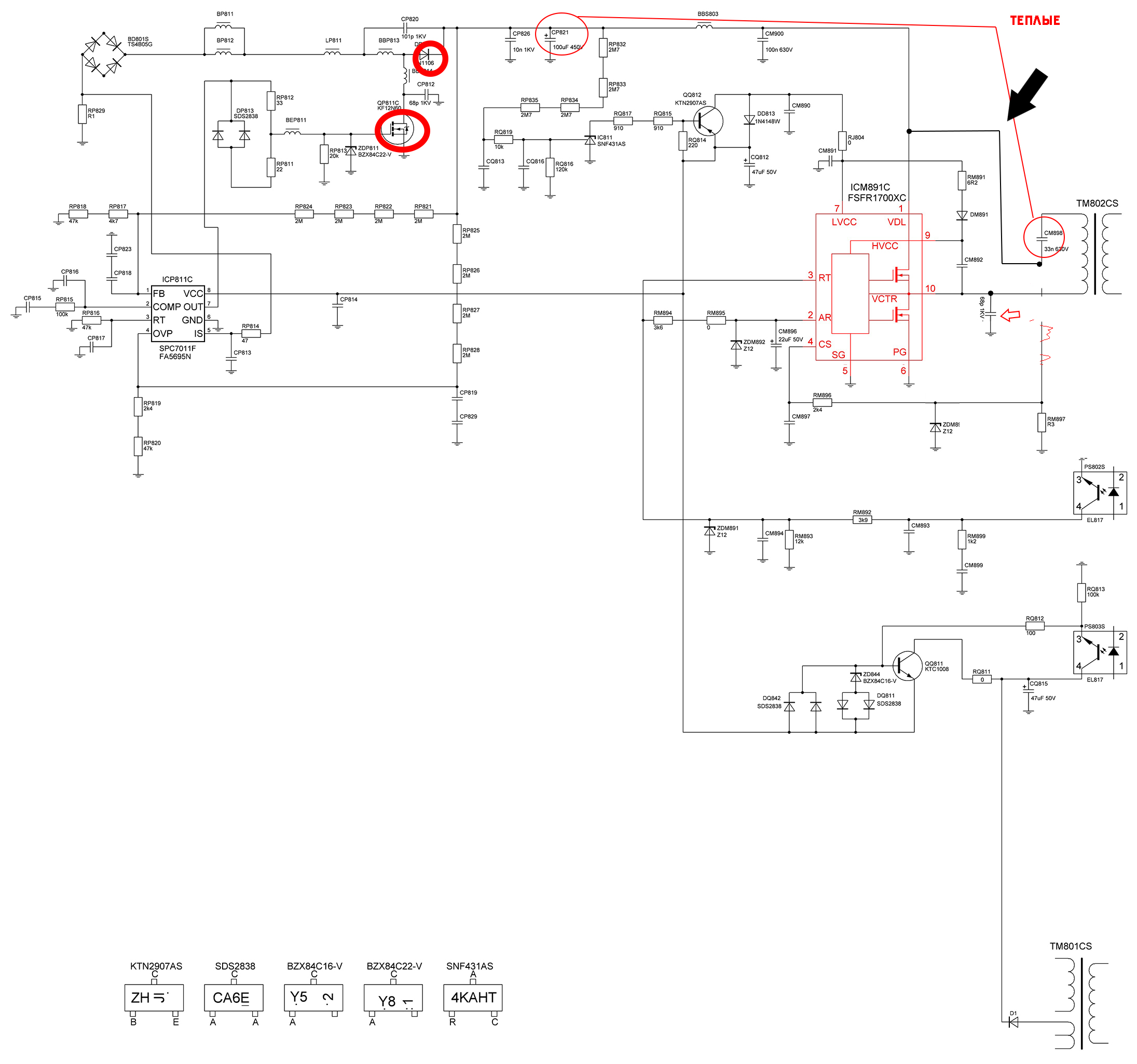 Блок питания> сгорел предохранитель, пробило в обвязке шимки SPC7011F(на плате icp801s) - мосфет TF11S60 (QP801S) и диод маркировка NUR460 (DP808).