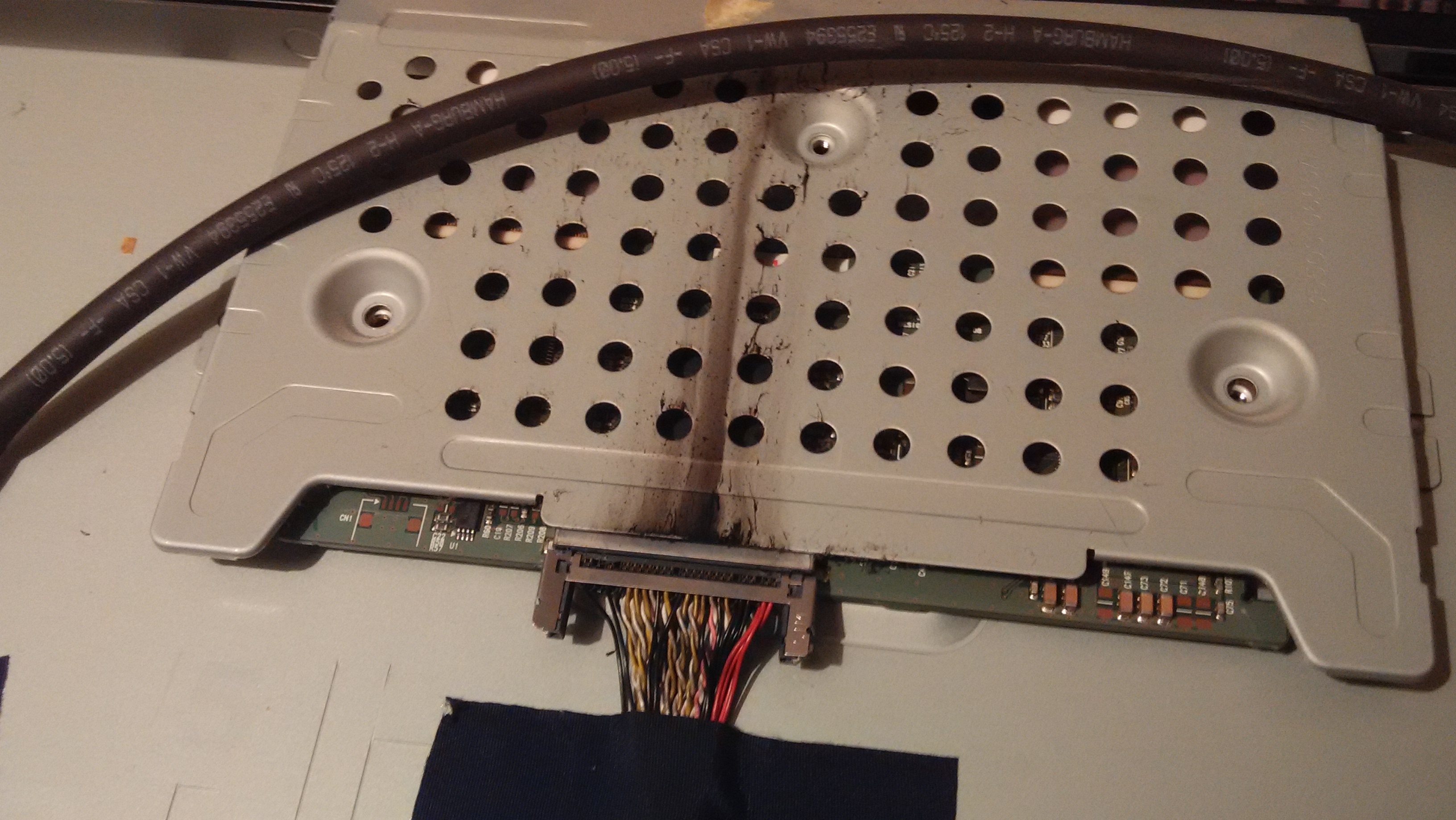 Во время работы телевизора Philips 42pfl5614/60 пропало изображение. При этом пошел сильный запах жженой пластмассы. При осмотре обнаружена копоть на разъеме и экране блока управления матрицей.