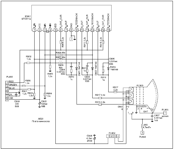 имя выложу позже. измерения катодов дал бы, еслиб знал где искать эти самые катоды, кстати там шлеифа 5 контактного с шасси на плату кинескопа небыло, распаял проводками попорядку, может там пара ног была перекинута? :ne_vi_del: