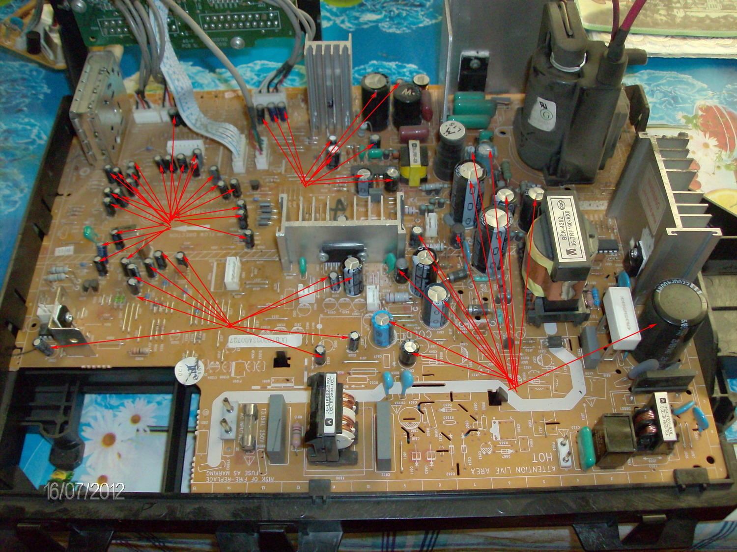 Спасибо. Не ожидал, что вы так относитесь к моей проблеме. Но вы указали все кондеры а это по моему излишне. Я понимаю, что они (кондеры) когда неисправны - вздуты. Но вот телек перестал запускаться после того как я слегка пошевелил их. Могу добавить, что телек работал около трех лет подолгу, и на полной громкости да еще с минисистемой - друган у меня глуховат. Читал, что проблема может находиться в системе защиты, и так же может быть непропай. Слышал что платы можно попробовать прогреть, чтобы восстановить контакт. Прошу не судить меня строго, когда то я пытался налаживать ламповый телевизор, даже знал где блок строчной развертки. Да и ремонт выпролнял чисто пробной заменой элементов схемы вплоть до ТРансформаторов, начиная с ламп.