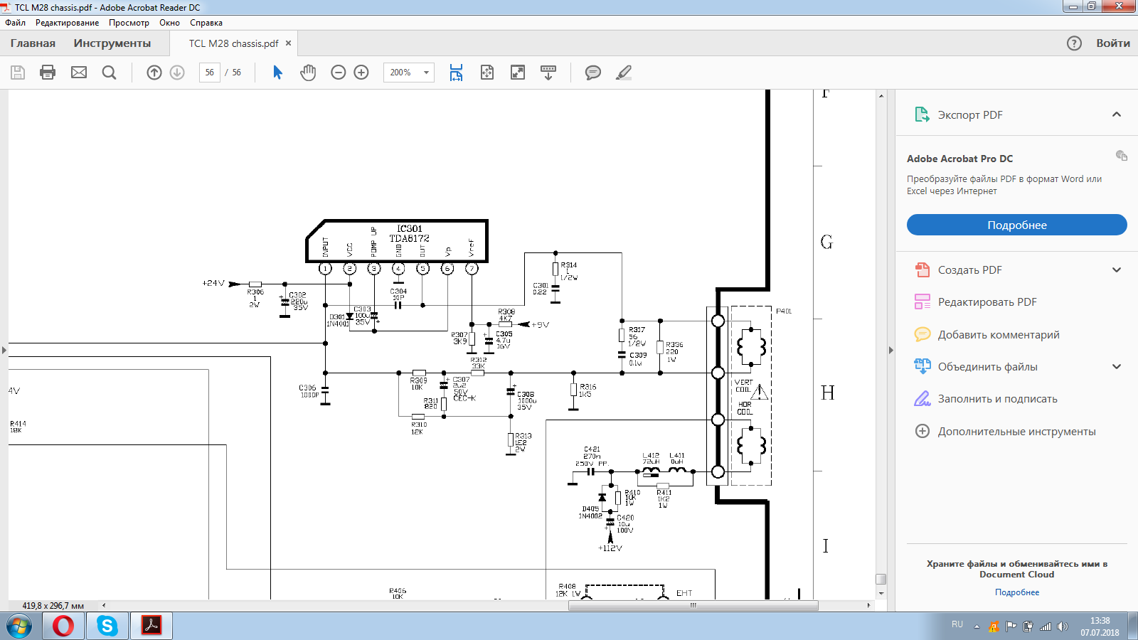 значит определил я таки шасси по процу, М28. Нашел схему. Все напряжения пристутствуют такие как: 5,9,12,24,33,112В То есть полностью все. Что со строчника, что с БП. Строчник запитан от БП 112В. Транзистор строчника целый. База Эмиттер 50 Ом, так как там резистор в транзисторе между ними(между БЭ). Другой Транзистор строчника Тоже целый. Всё четко. Значит таки все дела в микросхеме Строчной развертки STV9302B либо полетел проц\память. Я правильно понимаю? Телевизор просто не включился в один прекрасный момент(имею ввиду развертку(белая полоса горизонтальная)) был обесточен. Сказать чтоб молния или перепады в сети были не могу, так как батя вечно его выключает из сети. ИЗображения только нет, звук выдаёт.
