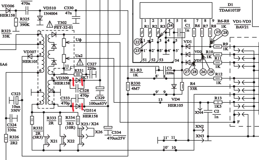На TDA6106JF 1,2,3,5 - плавают милливольты, на 6 - 200 вольт, на 7, 8, 9 по 29 вольт. На экране та же серая картинка с полосами. Звук есть.