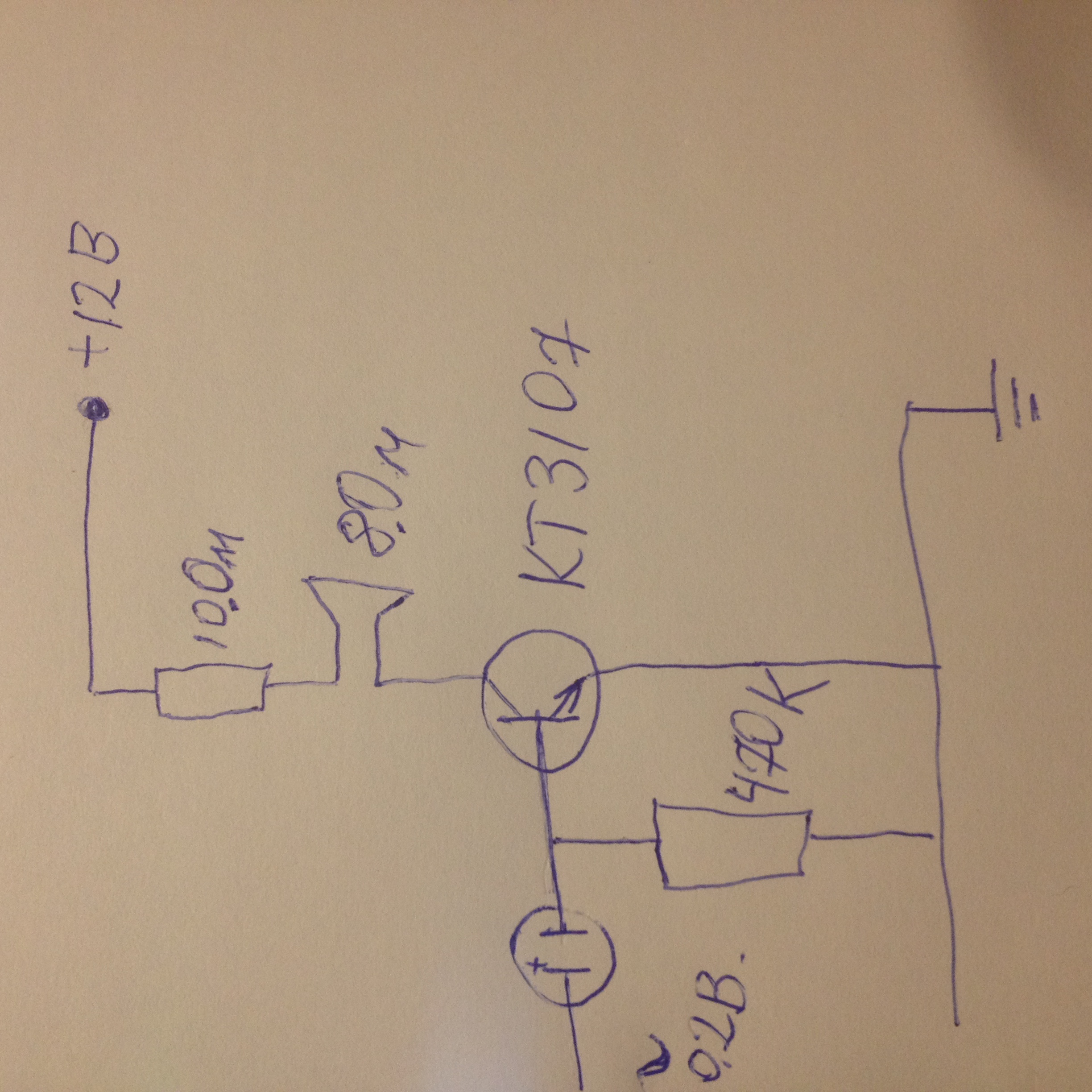 Попробуй 10ом и конденсатор оставить на месте, динамик включить между эмиттером и землёй а 470ком (лучше 750ком) поставь между базой и +12в. И громкость увеличится.