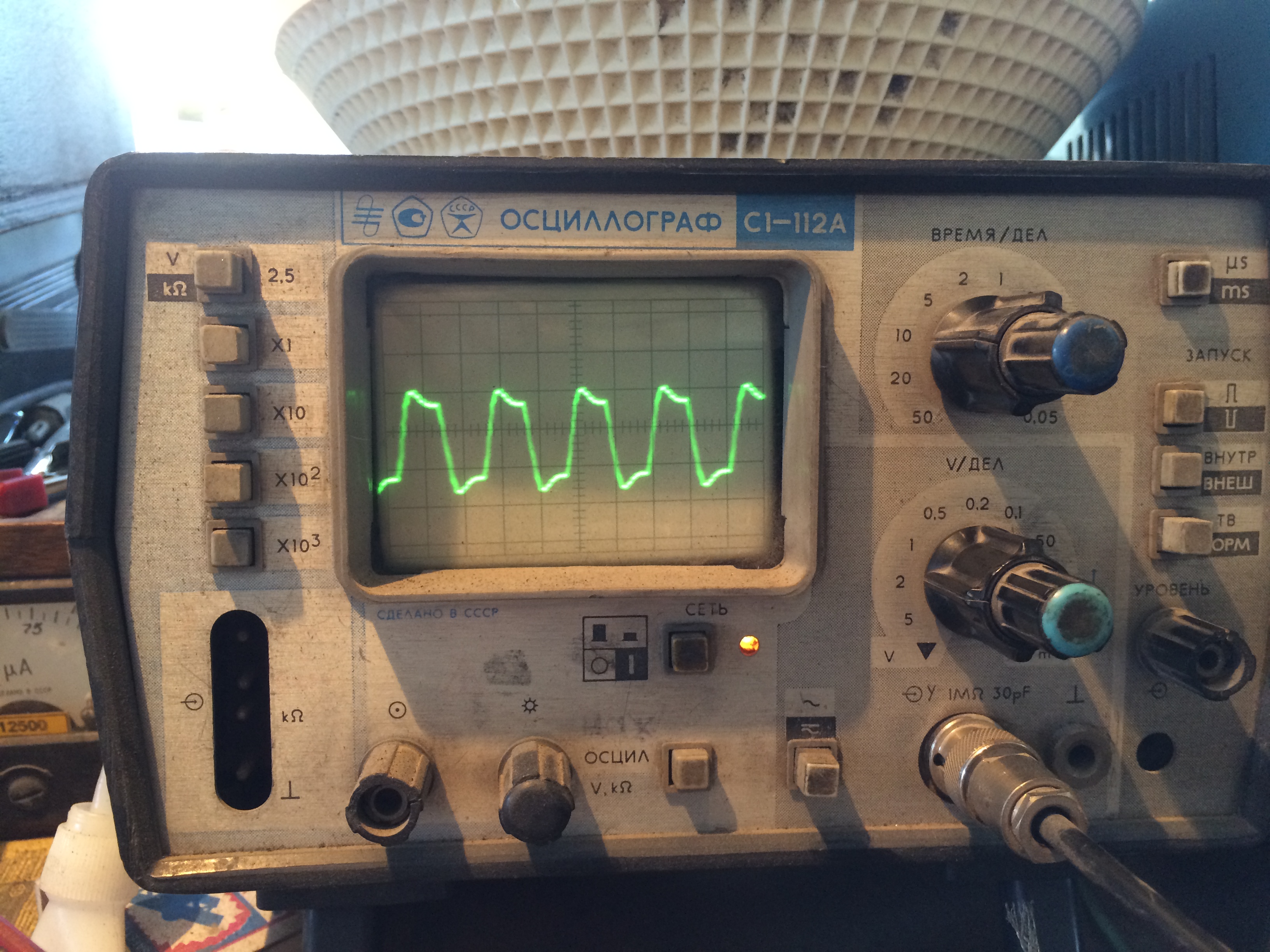 Звук у телевизора есть. Материнская плата работает, что подтверждено последующими действиями. При проверке сопротивления трансформатора инвертора TSM95026CT установлено, что они разные:1,21 кОм и 1,77 кОм. Купить его не смог. Найти данные datasheet не удалось. В старой версии с платой VY194G-06 использовался TMS94819TC. Был заказан на Алиэкспрес. После установки и проверке TV столкнулся с тем, что инвертор защищается. Вместо ламп поочередно подключал люминесцентную лампу, она загоралась на 5 сек. и выключалась. Отсоединив защиту OLP установлено, что изображение появилось, но подсветка очень-очень слабая. Восстановил защиту и параллельно всем лампам подключил R=91 кОм. В результате защита перестала срабатывать, но изображение так же тусклое. Выход из строя всех четырех ламп меня смущает. Больше похоже, что не подходит трансформатор. Были исследованы сигналы (форма и амплитуда). См. фото. Напряжение измерил тестером DT9205A+ через делитель 1/10 U= от 580 до 610 В на разных лампах (но только когда параллельно лампам стоят резисторы нагрузки). Частота приблизительно 50 кГц. По описанию из интернета это нормально. Кто может подсказать про транс и проверку всех четырех ламп.